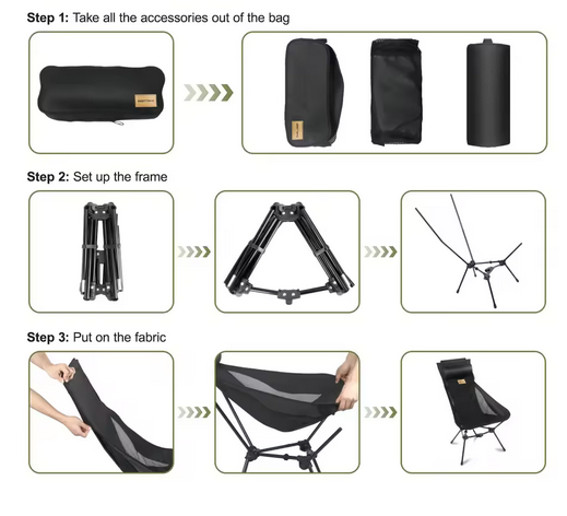 Rahmen aufklappen, Sitzstoff aufschieben, fertig. Nach kurzer Übung in unter einer Minute startklar. -